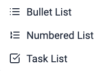 Creates a series of items broken up by bullet list, numbered list or task list |