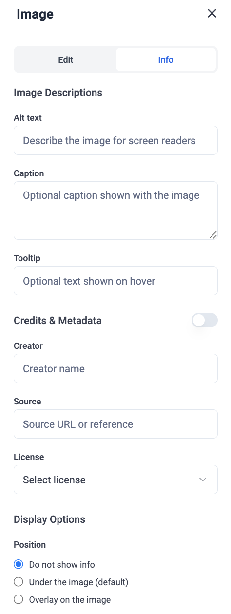This section is designed to add accessibility details, descriptive text, and attribution information to images in your articles. It helps make your content more accessible for screen-reader users, provides optional captions or tooltips for readers, and allows you to properly credit image sources and choose how that information is displayed.